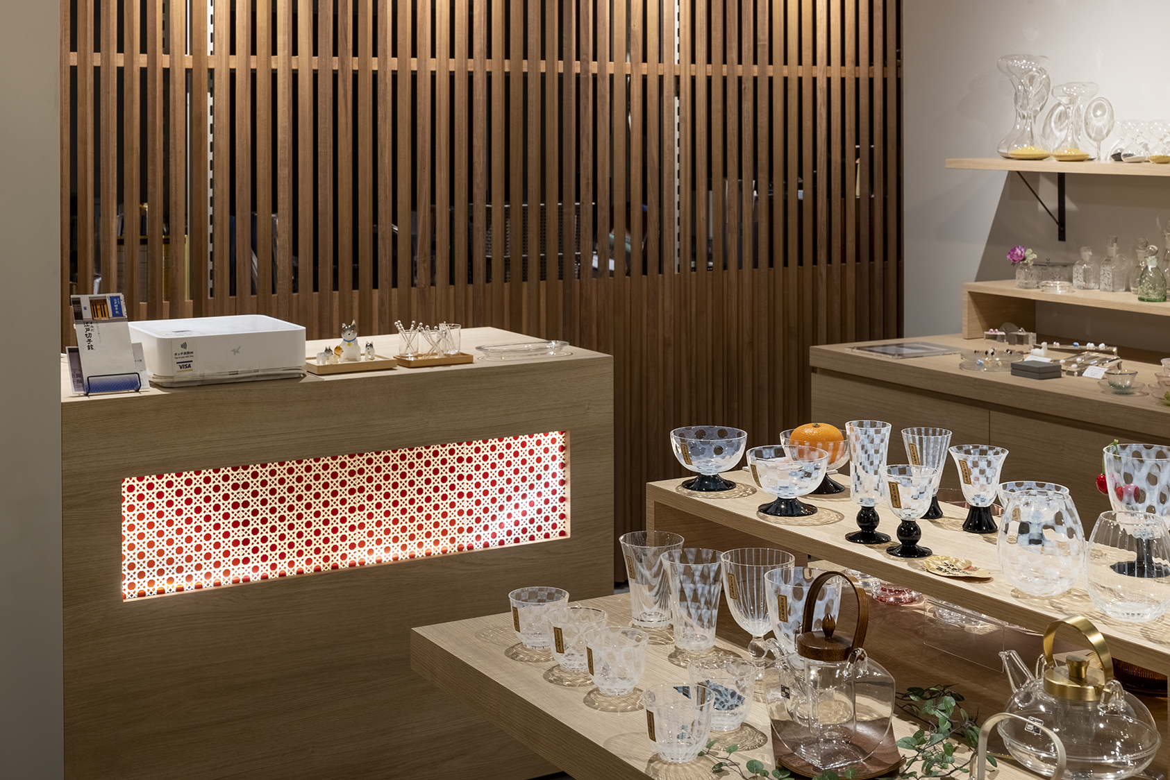 店内には、ガラスお醬油差しなど実際に手にとって購入できるショップに加え、建物のあちこちに再焼成したガラスのカケラや温かいランプの灯りが散りばめられています。